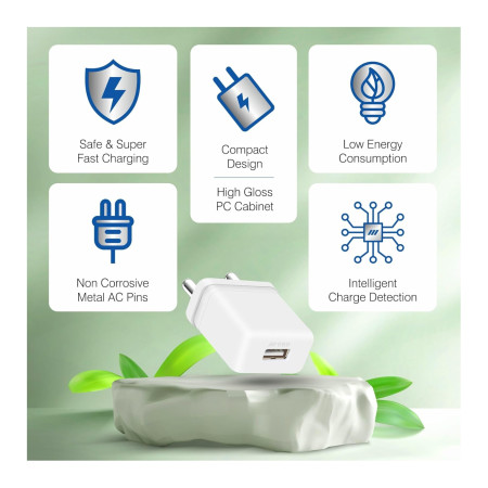 • Compact 10W USB-A wall charger for safe and efficient charging.