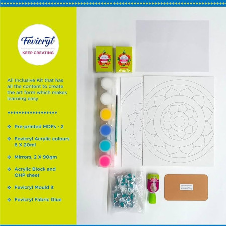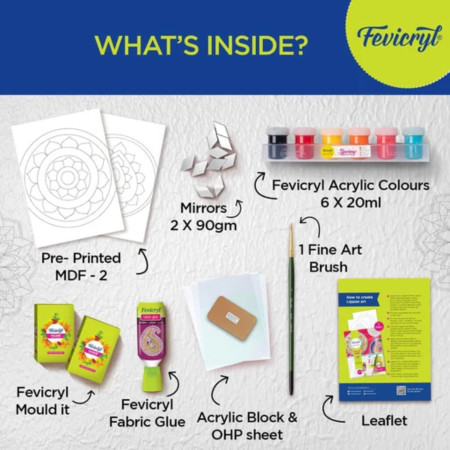 • ll-Inclusive Kit: Includes 2 Pre-printed MDF boards, Fevicryl Mouldit clay (90g), fabric glue, varied mirror shapes, 6 acrylic colors (20ml each), and a round brush.